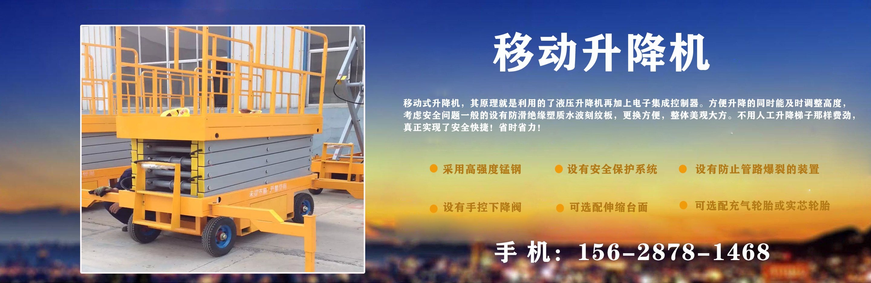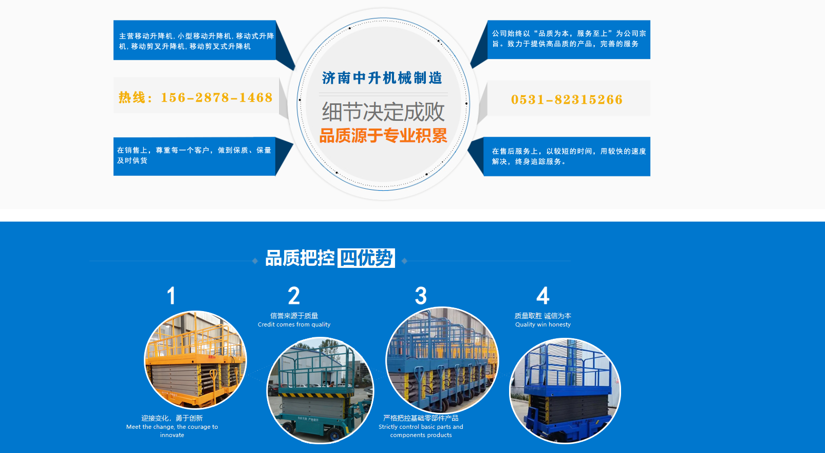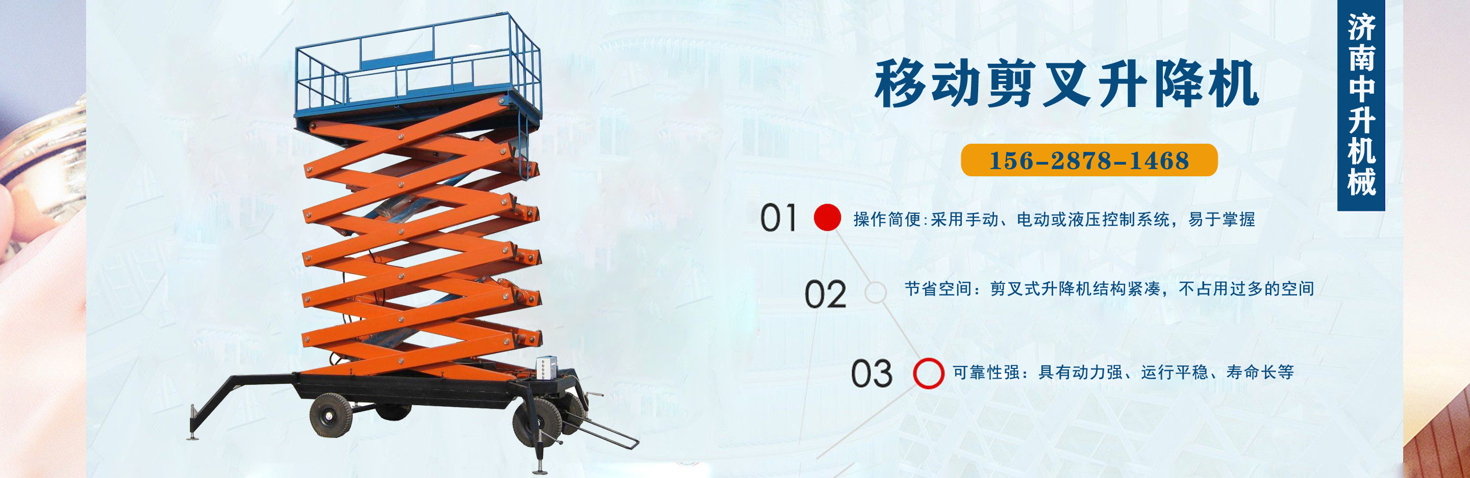 濟南中升機械制造有限公司主營移動升降機,小型移動升降機,移動式升降機,移動剪叉升降機,移動剪叉式升降機等產品,信譽良好,歡迎前來咨詢訂購! 在銷售上,尊重每一個客戶,做到保質、保量及時供貨;在售后服務上,以較短的時間,用較快的速度解決,終身追蹤服務。 公司始終以“品質為本,服務至上”為公司宗旨。致力于提供高品質的產品,完善的服務,快捷的供貨,無論您身處何方,都能感受到我們的優良服務。客戶至上,誠信為本?! g迎各界朋友來電,來函垂詢,選購!...